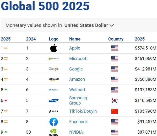 • 분석: 전자상거래와 클라우드(AWS), 프라임 멤버십 등으로 세계 최대 플랫폼 중 하나인 아마존은 2024년에 이어 4위를 유지한 것으로 보입니다. 최근 경기 불안과 소비 둔화, 테크 기업 구조조정 이슈 등으로 성장세가 주춤했지만, 여전히 강력한 브랜드 파워를 바탕으로 4위를 유지하고 있습니다.