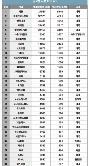 이번에는 2025년 세계 기업 시가총액 순위 상위 40개 기업을 순서대로 정리해봤습니다. 각 기업의 시가총액은 원문 표에 따르면 ‘억 달러(약 ○조 달러)’와 ‘조 원(원화 환산)’ 단위로 환산된 값이며, 국가별 환율과 경제 상황 등에 따라 실제 수치는 달라질 수 있습니다. 다만 본 자료를 통해 대략적인 기업 규모와 각사의 주요 특징을 살펴보시기 바랍니다.