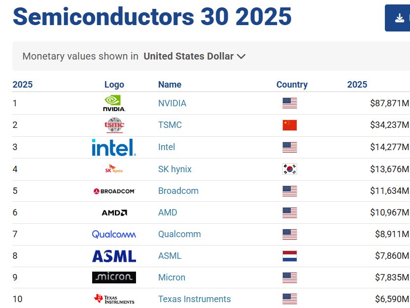 이번에는 Semiconductors 30 2025 표(스크린샷)에 나타난 상위 반도체 기업(주요 10개사)의 2025년 가치(USD 기준)와 해당 섹터 전반의 동향을 분석한 내용입니다.