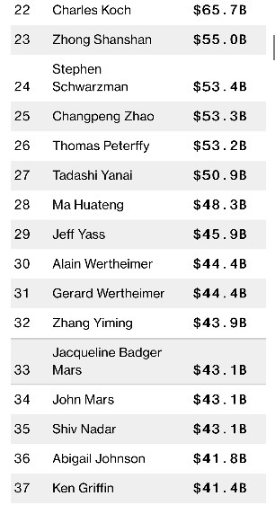 • Charles Koch (22위), Julia Flesher Koch & family (21위) - 코크 인더스트리(실물+투자)