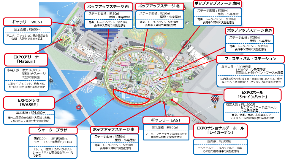 • 엑스포 아레나 ‘마쓰리’: 최대 16,000명 규모의 야외 라이브·축제 개최