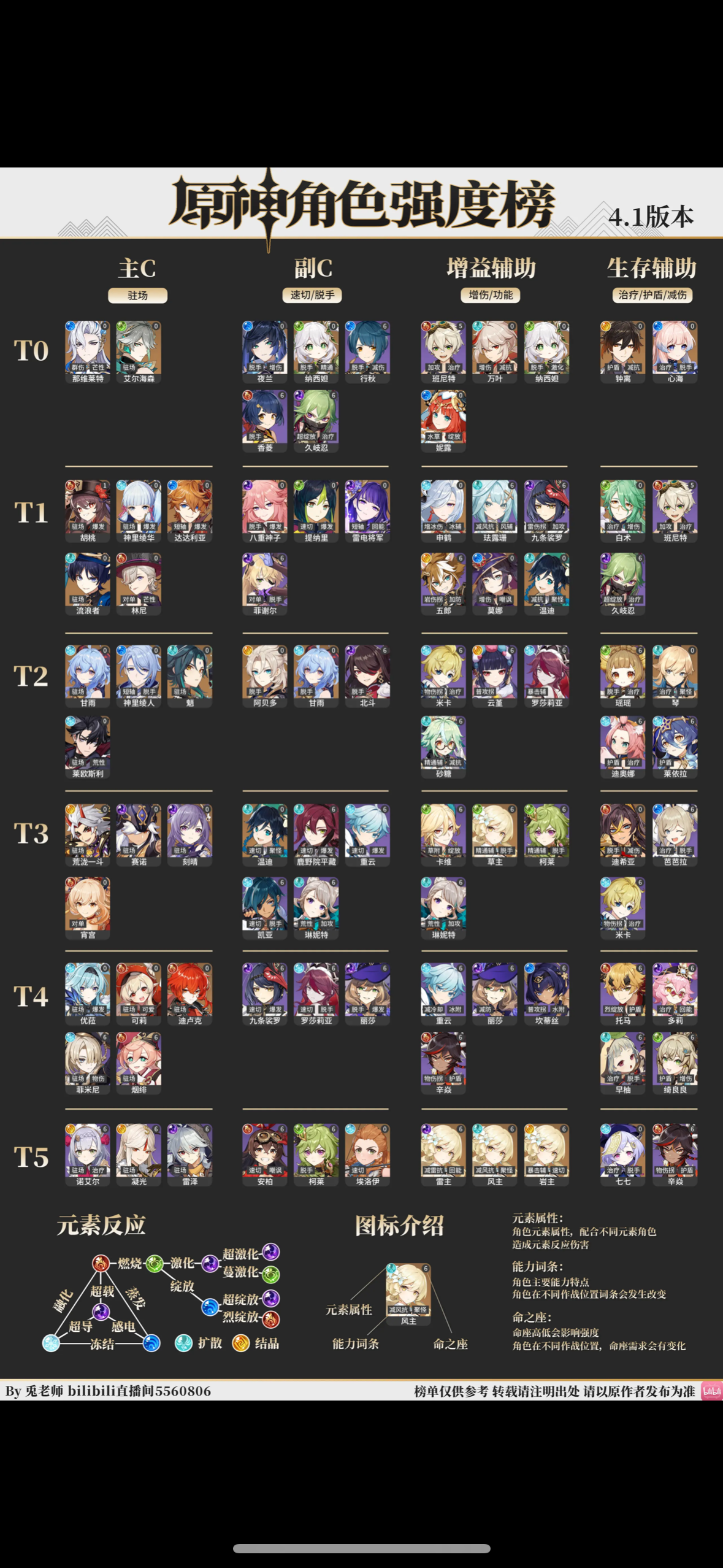 원신(原神) 4.1 버전의 캐릭터 티어 리스트입니다. 각 캐릭터를 메타 강세에 따라 T0 ~ T5 등급으로 나누었으며, 역할에 따라 주 C(메인 딜러), 부 C(서브 딜러), 증익 서포터(버프/기능 제공), 생존 서포터(힐/방어/피해 감소)로 구분하고 있습니다.
