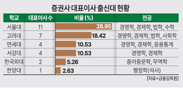 국내 최고학부인 서울대 출신 CEO는 여전히 높은 비중을 차지하며 미래에셋증권, SK증권, 교보증권 등 주요 증권사의 경영을 이끌고 있다. 그러나 이들 중에서도 학벌보다는 경영 능력과 실적에 초점을 맞춘 변화가 감지되고 있다.