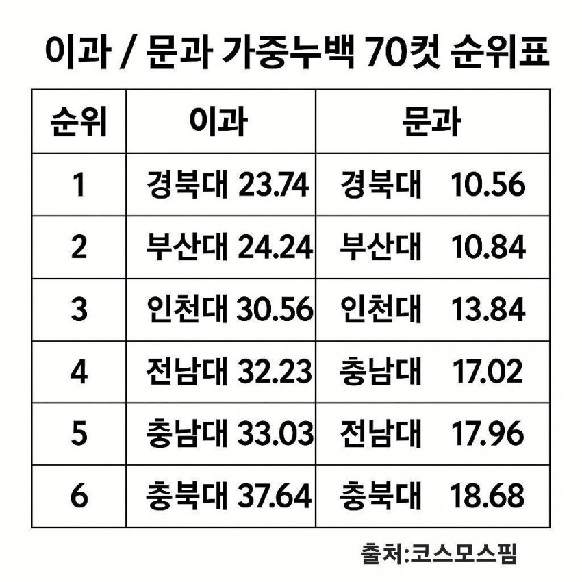 오늘은 최신 기준으로 공개된 이과 / 문과 가중누백 70컷 순위표를 바탕으로, 각 학교의 실제 입결 흐름과 특징을 한눈에 정리해봤습니다.