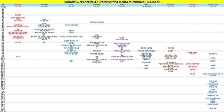 그 뒤로는 충남대학교(17.02), 전남대학교(17.96), 충북대학교(18.68)가 큰 격차 없이 이어지며, 문과 역시 상위 3강 + 중하위권 3개교 구조로 요약됩니다.
