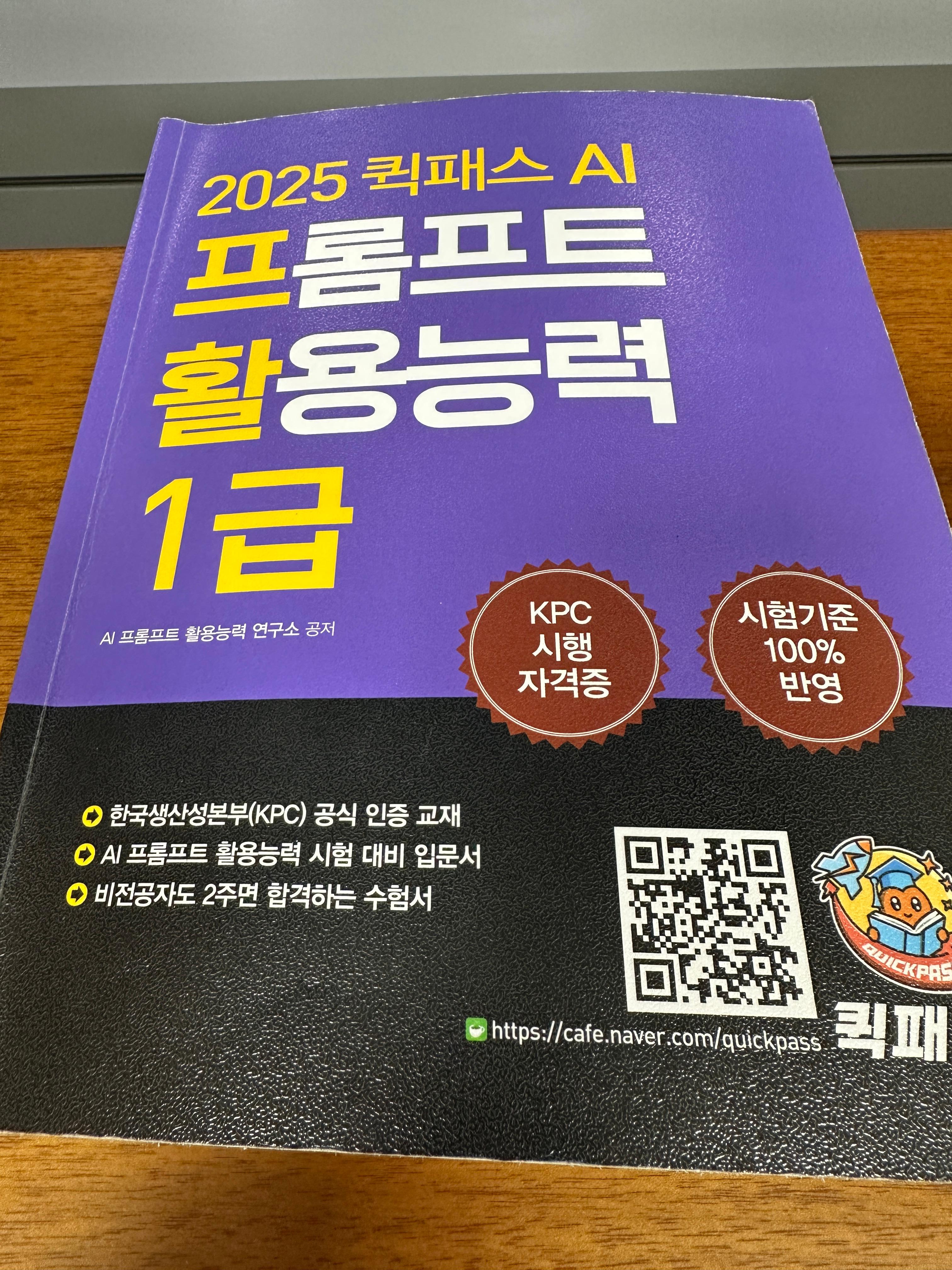 공식 교재 활용: 한국생산성본부(KPC) 공식 인증 교재인 「퀵패스 AI 프롬프트 활용능력」 시리즈를 활용한 학습이 권장됩니다 . 해당 교재는 1급·2급 시험 출제기준을 100% 반영하여 구성된 공식 교재로, 이론부터 실습 예제, 예상문제까지 수록되어 있어 독학용으로 적합합니다 . 실제 합격자들도 퀵패스 교재를 1~2회 정독하고 각 장의 연습문제와 모의고사를 풀어보는 방식으로 공부했다고 합니다 . 이론 파트는 생소한 개념이 많으므로 핵심 키워드 위주로 요약하며 학습하고, 각 장의 예상문제를 통해 이해도를 점검합니다 .