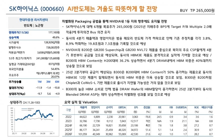 • SK하이닉스는 HBM3 및 HBM3E 메모리 반도체에서 시장 선도적인 위치를 차지하고 있으며, NVIDIA와의 강력한 협력으로 AI 시장의 수요를 흡수하고 있습니다.