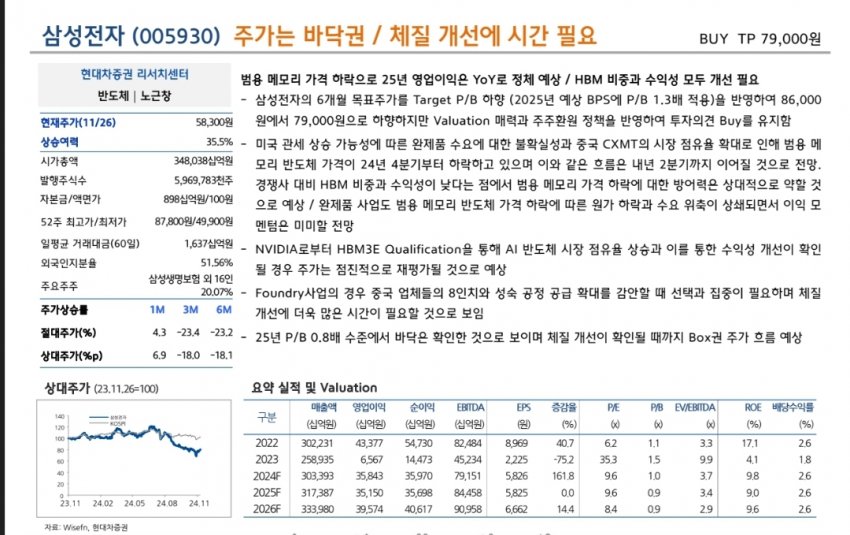 • 삼성전자의 P/B(주가순자산비율)는 현재 0.8배 수준으로 평가되며, 이는 SK하이닉스(2.0배)와 큰 차이를 보이고 있습니다. 이는 삼성전자가 체질 개선과 신제품 매출 확대에서 시간이 더 필요함을 의미합니다.