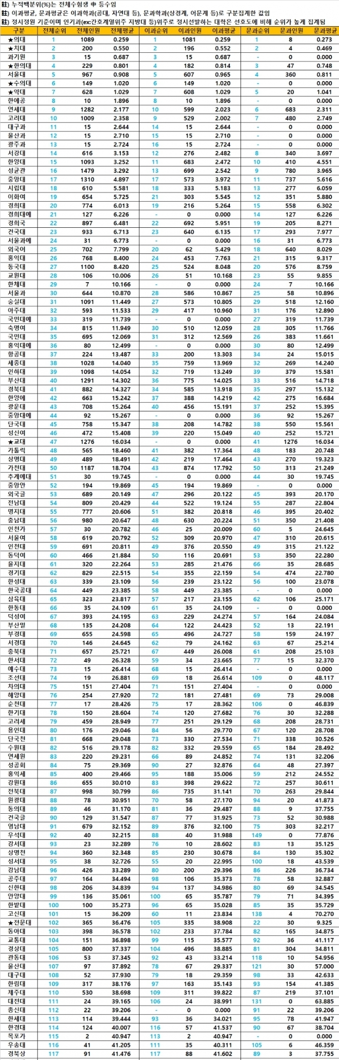 입시 전문가들이 평가한 대학 서열을 인문계열과 자연계열로 나누어 정리하면 다음과 같습니다. (정시 입결의 수평 비교가 어려운 의대, 치대, 한의대, 약대 등 전문계열 및 카이스트, 포항공대, 4대 과기원, 켄텍 등 이공계 특성화 대학과 농협대, 항공대 등 특수목적 대학은 제외하였습니다.)