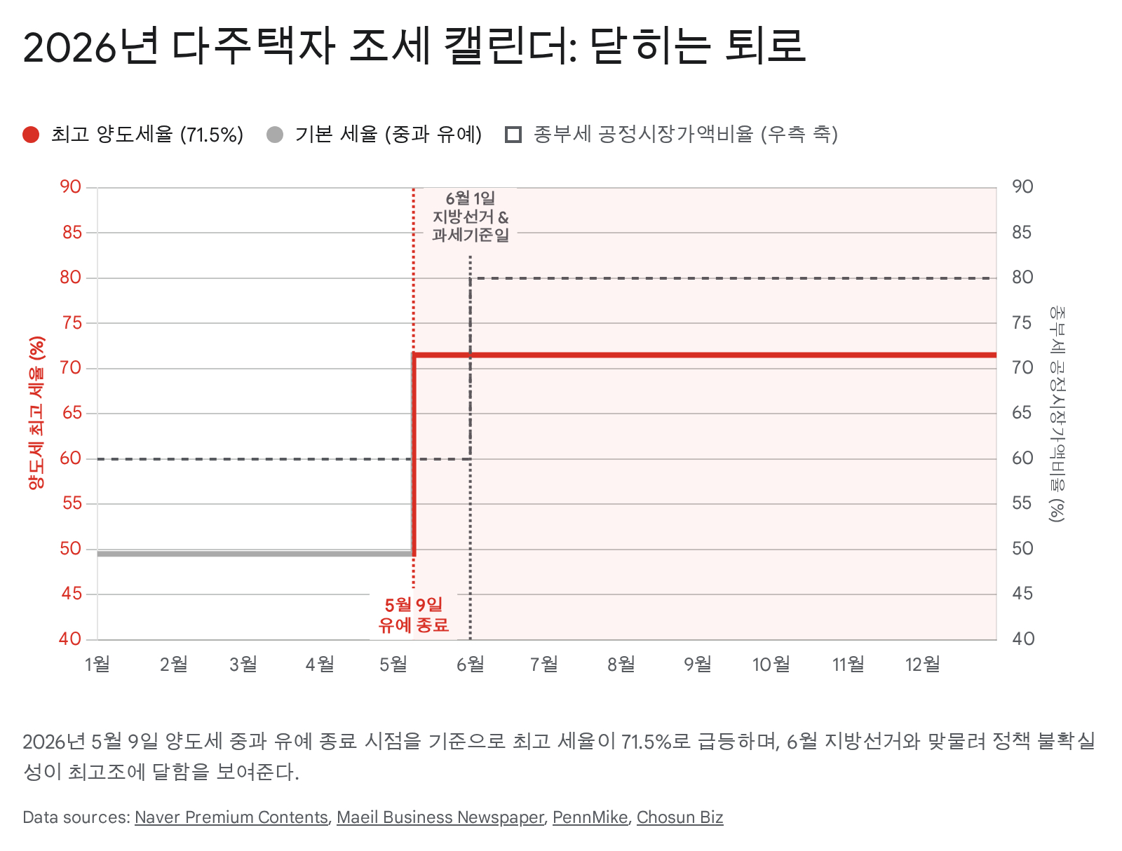 다주택자에게 2026년 상반기는 공포의 시간이다. 핵심은 2026년 5월 9일까지 한시적으로 적용되던 '다주택자 양도소득세 중과 유예' 조치의 종료 여부다. 윤석열 정부에서 시행된 이 조치가 종료되고 중과세가 부활할 경우, 대한민국의 부동산 세제는 세계적으로 유례를 찾기 힘든 징벌적 구조로 회귀한다.
