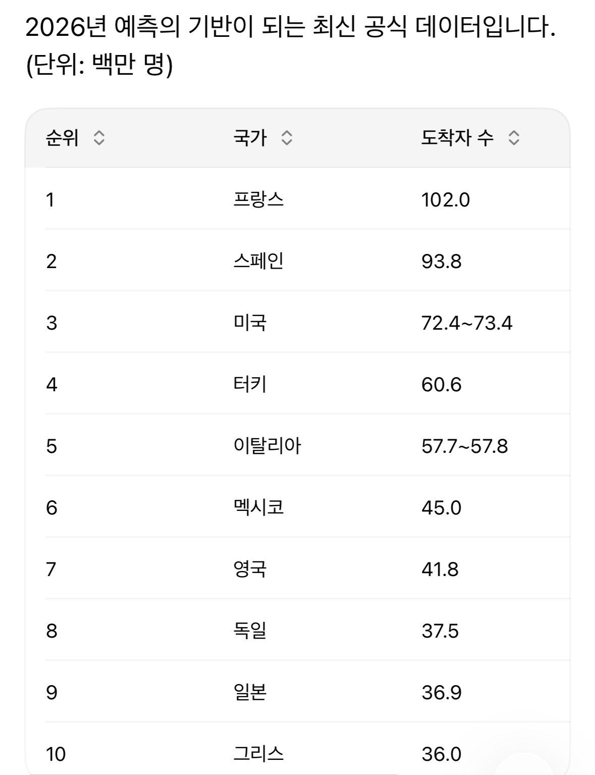 2. 2026년 순위 예상(UN Tourism 기준, Top 10)
