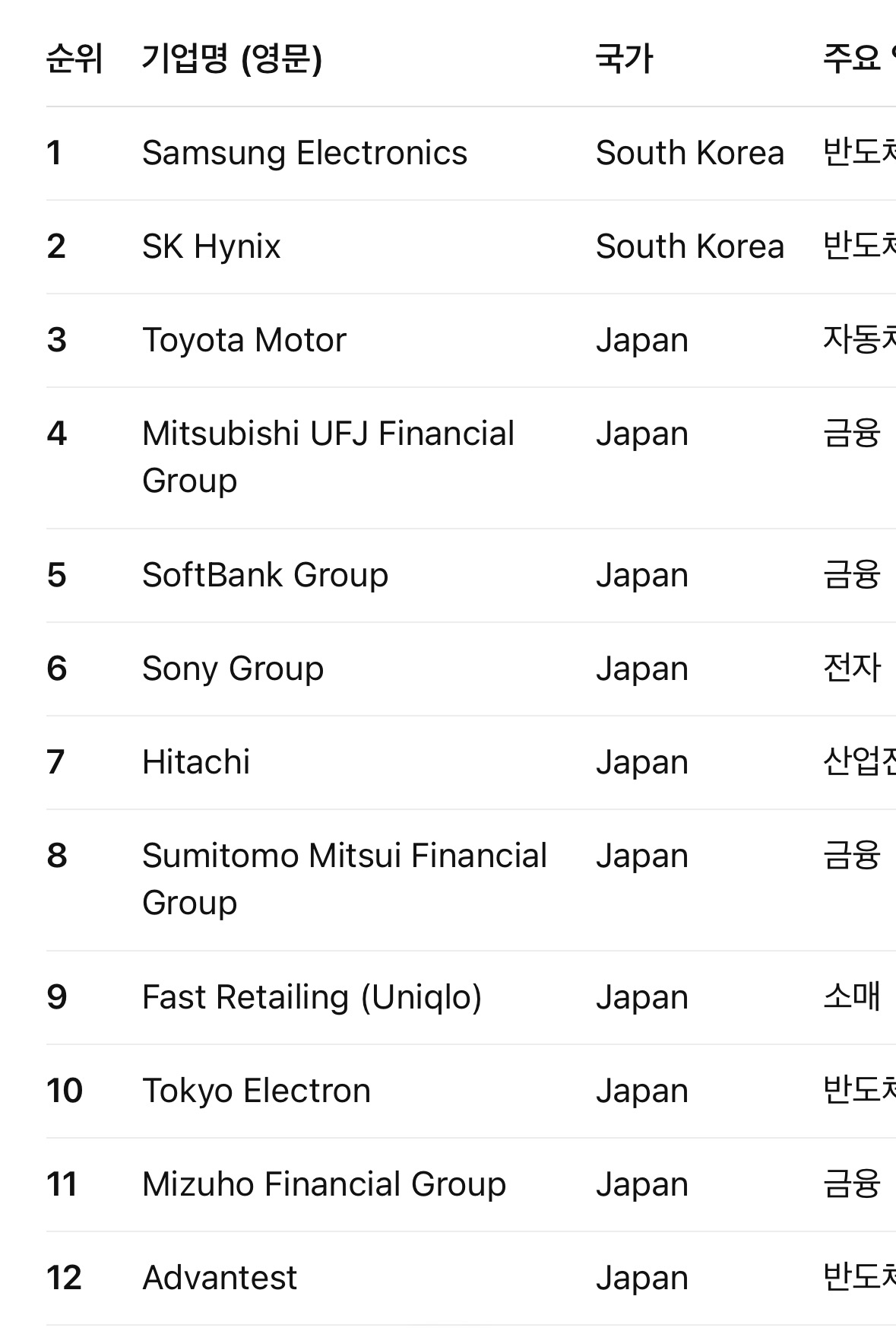 2026년 1월 초 현재 한국과 일본 증시에 상장된 기업 중 시가총액 기준 1위는 한국의 삼성전자(약 $637.22 B, 6372억 달러)이며, 2위는 하이닉스, 3위는 일본의 도요타 자동차(약 $288.71 B, 2887억 달러)로 나타났습니다  . 아래 표에는 양국 상장기업 가운데 시가총액 상위 50개 기업의 순위, 기업명(영문), 국가, 주요 업종, 시가총액(억 달러 단위)을 정리했습니다. (시가총액은 원화/엔화 표시 시가총액을 2026년 1월 초 환율로 달러 환산한 값입니다.)