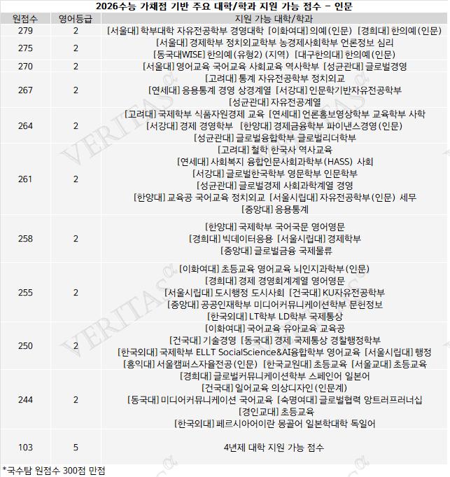 2. 인문계열: 점수대별 지원 가능 대학/학과