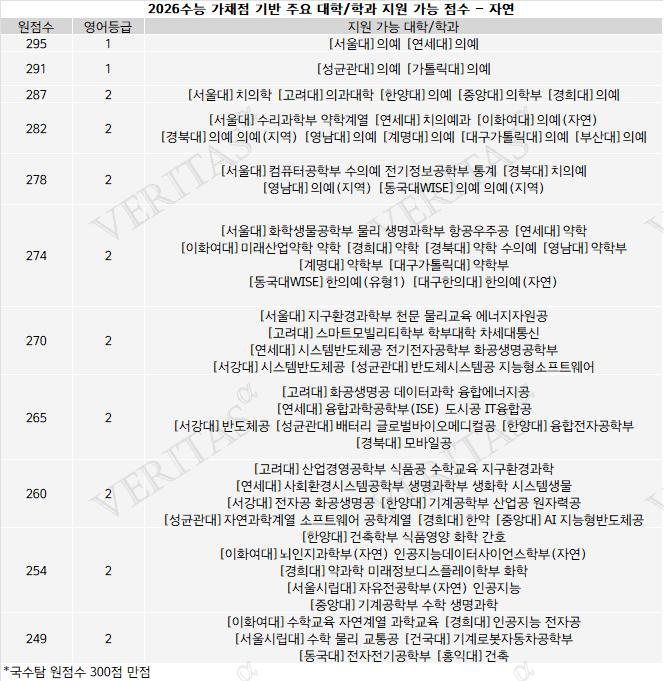 <td>서울대·연세대 의예과 등 최상위 의대 [oai_citation:47‡v.daum.net](https://v.daum.net/v/20251114172301030?f=p#:~:text=%EC%9E%90%EC%97%B0%EA%B3%84%EC%97%B4%EC%97%90%EC%84%A0%20%EC%84%9C%EC%9A%B8%EB%8C%80%20%EC%9D%98%EC%98%88%EA%B0%80%20294%EC%A0%90%2C%20%EC%97%B0%EC%84%B8%EB%8C%80,%EB%B9%84%EC%88%98%EB%8F%84%EA%B6%8C%20%EC%9D%98%EB%8C%80%EB%8A%94%20%EC%B5%9C%EC%A0%80%20275%EC%A0%90%EC%9C%BC%EB%A1%9C%20%EC%A0%84%EB%A7%9D%EB%90%90%EB%8B%A4)</td>