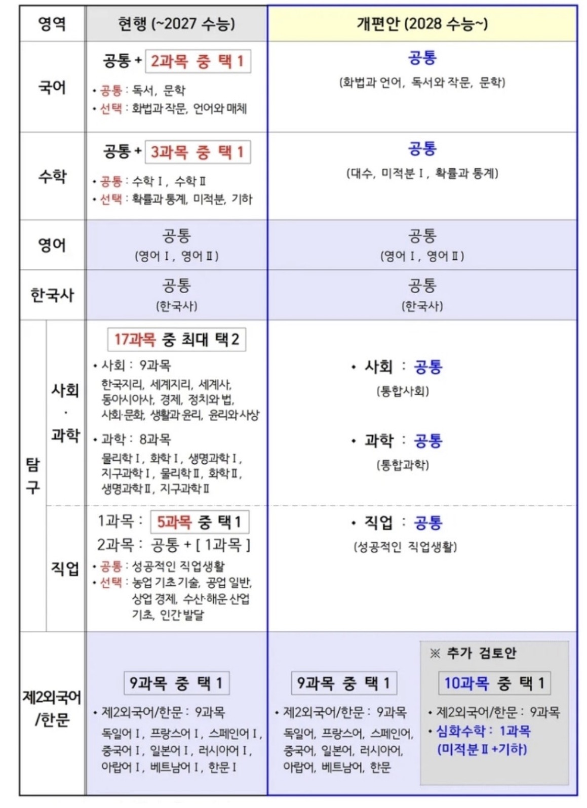 • 변경 내용: 탐구 영역은 ‘통합사회’·‘통합과학’ 과목으로 전면 개편됩니다. 현행은 사회 9개, 과학 8개 중 각 최대 1과목씩(총 2과목) 선택 응시하던 체제였습니다 . 개편안에서는 모든 수험생이 공통사회·공통과학 시험을 치러야 합니다  .