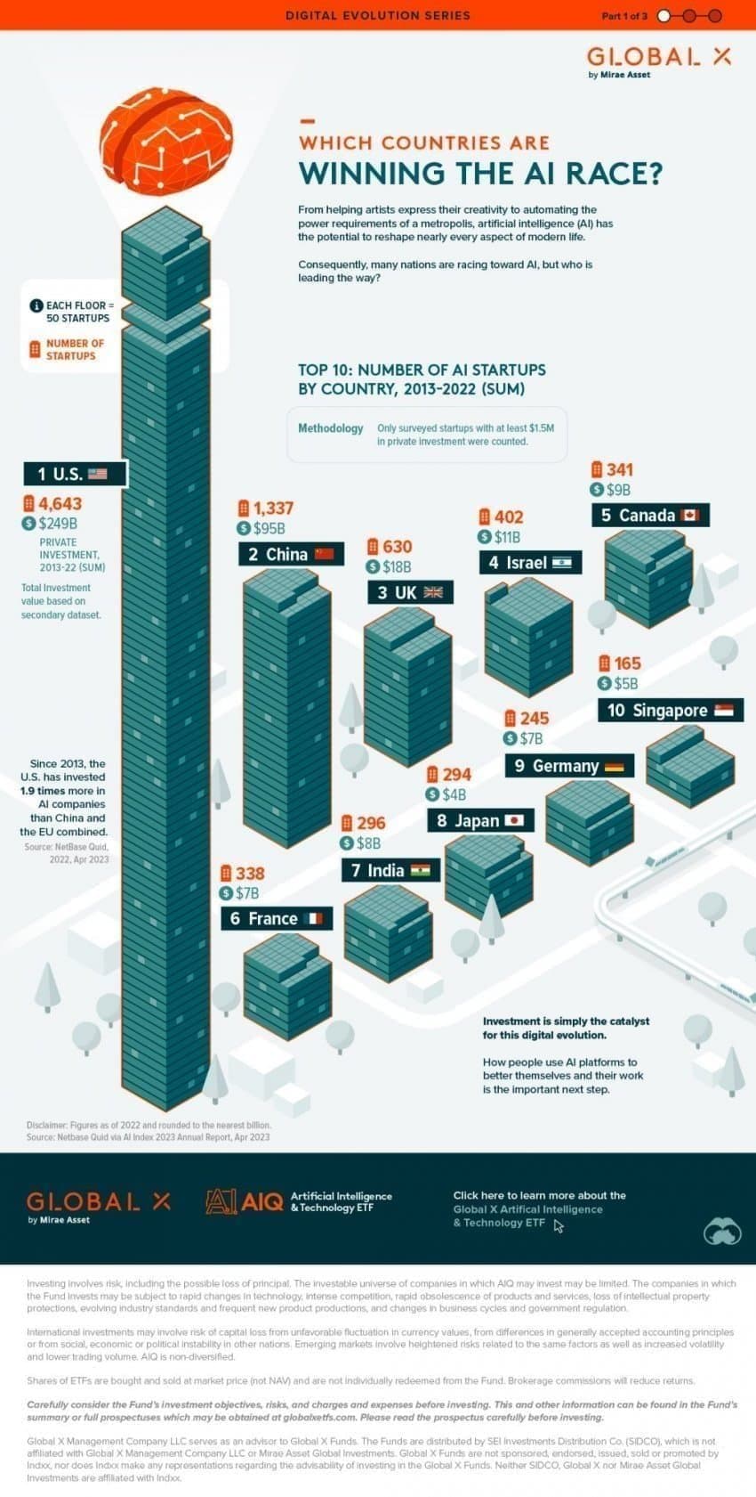 2023년까지 인공지능(AI) 산업은 전 세계적으로 가장 빠르게 성장하는 기술 분야 중 하나로, 국가별 AI 스타트업 수와 투자 규모는 AI 생태계 경쟁력을 보여주는 핵심 지표입니다. 아래는 2013년부터 2022년까지 AI 스타트업 수 기준 TOP 10 국가와 투자 현황을 기반으로 한 분석입니다.