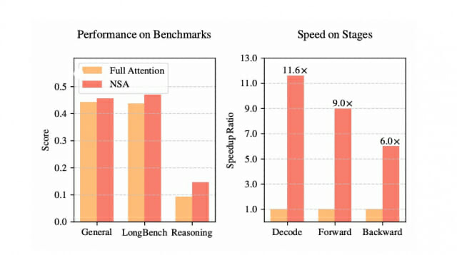 NSA를 적용한 모델은 여러 분야의 벤치마크 테스트에서 기존 풀 어텐션 모델을 뛰어넘는 성능을 보였습니다.