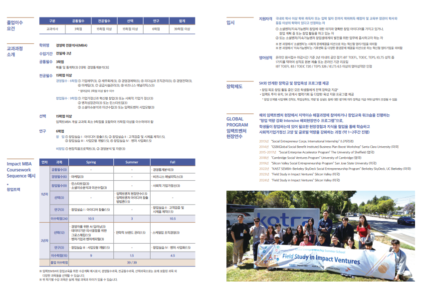 - 복수학위 기회: University of Maryland, City University of London과 같은 대학들과의 복수학위 프로그램을 통해 글로벌 소셜벤처 및 지속 가능 경영 분야에서 전문가로 성장할 수 있습니다.