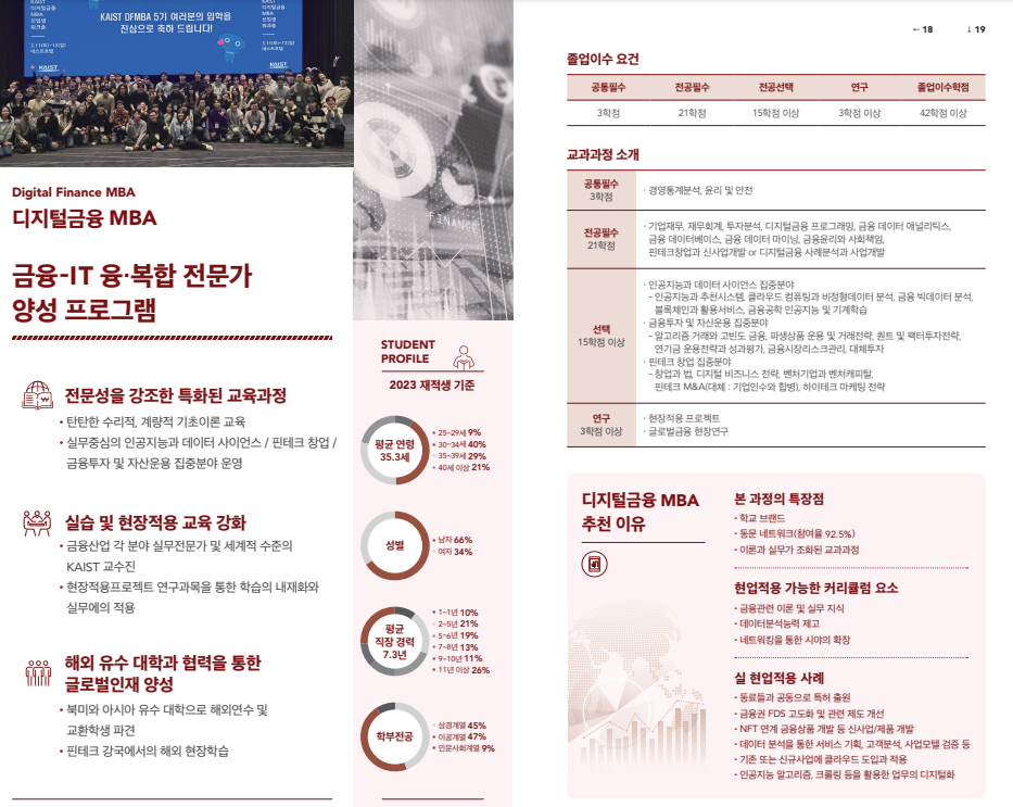 KAIST의 MBA 프로그램은 금융 및 경영 분야에서 국내 최고 수준의 교육을 제공하며, 각 과정은 실무와 이론을 균형 있게 접목하여 학생들이 다양한 산업에서 리더로 성장할 수 있는 기회를 제공합니다. 이 글에서는 KAIST의 금융MBA, 금융공학석사, 디지털금융MBA, 테크노MBA(카이스트MBA), 그리고 임팩트MBA에 대해 학제, 주요 커리큘럼, 특장점, 그리고 복수학위 기회를 상세히 소개합니다.