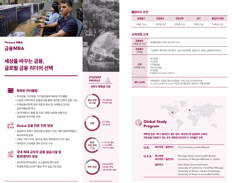 금융MBA는 투자금융 및 자산운용에 특화된 프로그램입니다. 사례 연구와 금융 데이터 분석 등을 통해 학습한 이론을 실무에 적용할 수 있으며, 금융 데이터베이스, 금융 프로그래밍 과목도 포함되어 있습니다. 이 과정에서는 2학년 1학기에 필수 해외 연수 또는 복수학위 프로그램에 참여하여 국제적인 경험을 쌓을 수 있습니다.