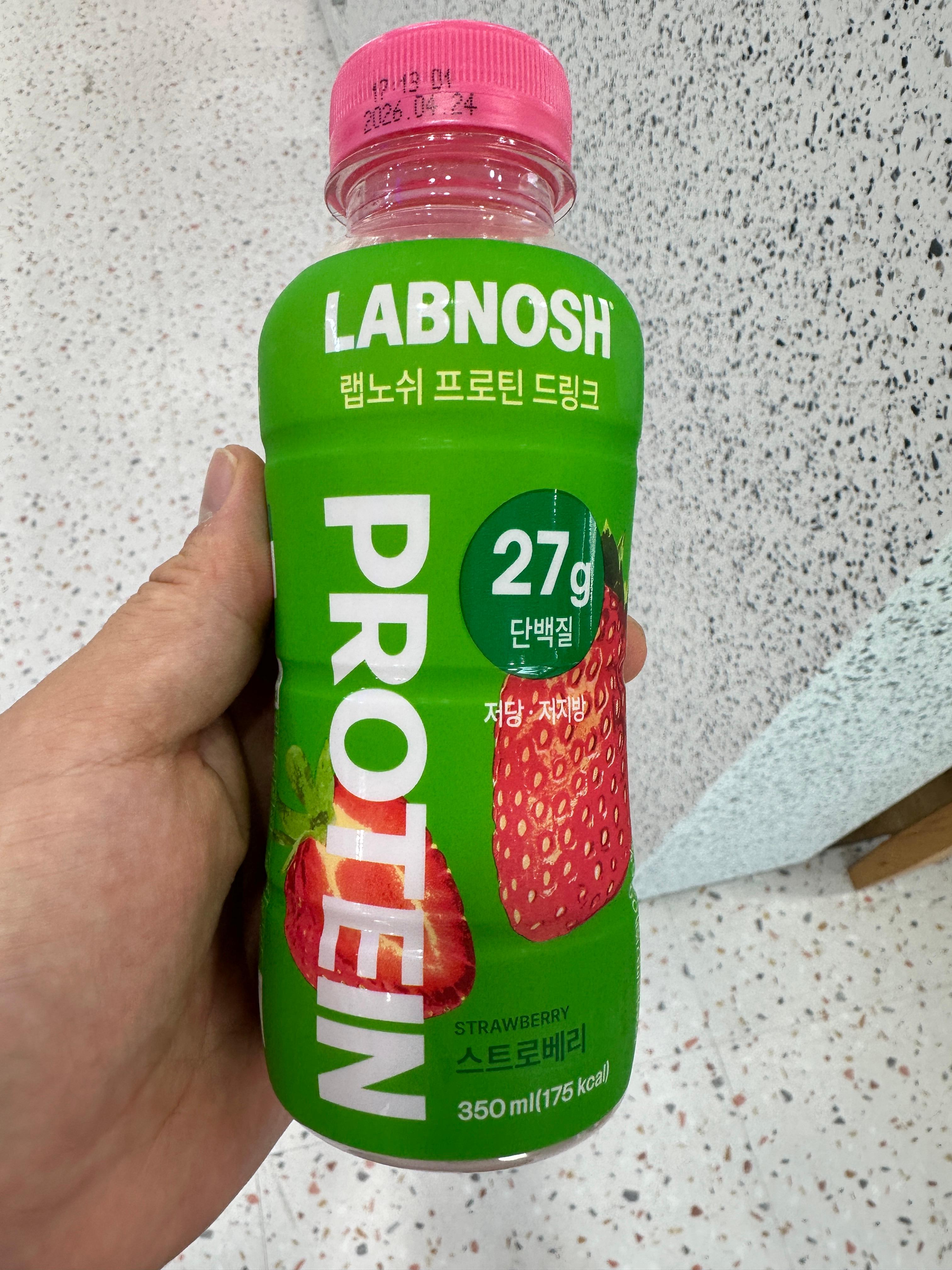 LABNOSH 딸기맛 랩노쉬 (이그니스) 350ml 27g  165kcal  6g  우유단백 (WPI+농축우유단백)  3,500원 (편의점가, 2+1 행사) ~2,000원 (온라인 세트가)