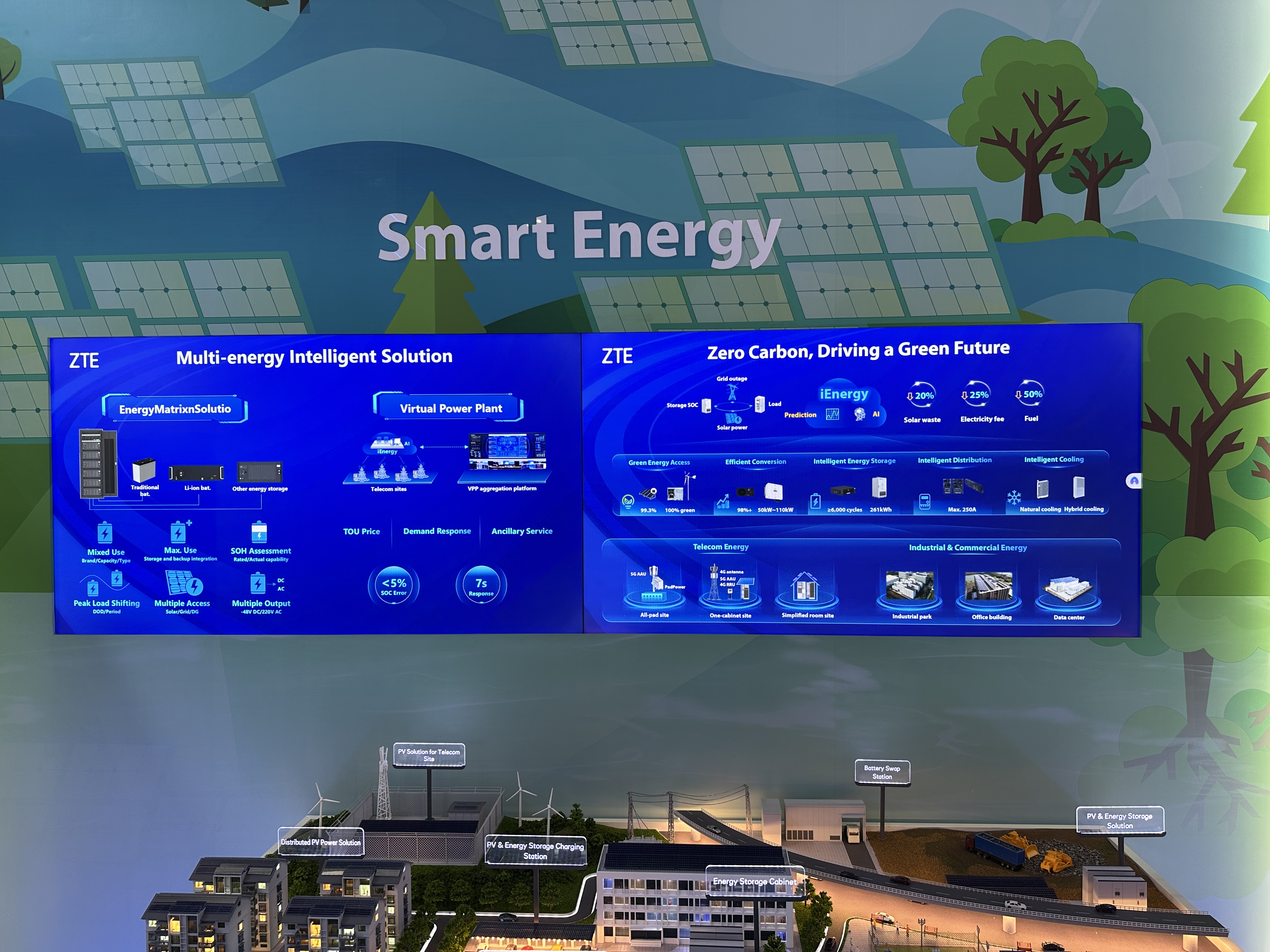 ZTE 부스의 또 다른 주요 전시 주제는 스마트 에너지 솔루션으로, ICT 인프라의 지속 가능성과 친환경 운영을 위한 다양한 기술들이 소개되었습니다.
