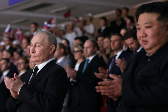Russian President Vladimir Putin and North Korean leader Kim Jong-un attend a gala concert in Pyongyang on Wednesday. [REUTERS/YONHAP]