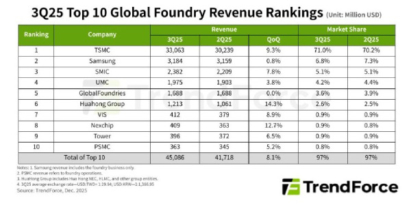 중국 화홍그룹(HuaHong Group)은 6위 자리를 유지하며 점유율 2~3%대를 기록했습니다. 2025년 3분기 화홍그룹은 2.6%의 글로벌 점유율을 차지했고, 매출은 약 12.1억 달러로 전분기 대비 증가하였습니다  . 자회사 HHGrace의 12인치 캐파 증설 및 고가 웨이퍼 출하 증가가 실적을 견인하여 화홍그룹은 중국 내수 수요에 기반한 성장을 지속하고 있습니다 .