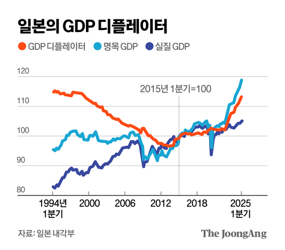 • Rising Inflation and Nominal GDP: Thanks to these efforts and also helped by a surge in global inflation post-2021, Japan finally escaped deflation. By the late 2010s, inflation was modestly positive (around 0.5–1%), and after 2021, it rose above 2% for the first sustained period in decades . The GDP deflator turned upward after 2013, indicating broad inflation in the economy instead of deflation. Crucially, nominal GDP started to grow at a healthy pace. From the end of 2012 through 2019, Japan’s nominal GDP gained ground (though briefly interrupted by a dip during the 2020 pandemic). Then, with the global inflationary environment of 2021-2022, nominal GDP leapt further. By 2023, Japan’s quarterly nominal GDP was around ¥590–600 trillion (annualized), up roughly 20-25% from a decade earlier . To put it in perspective, Japan’s nominal GDP in 2023 was at a record high in yen terms, finally decisively above the mid-1990s levels. It grew about 23–24% from 2013 to 2023 alone , signaling a clear break from the prior era of stagnation. In the second quarter of 2025, nominal GDP reached ¥633 trillion (seasonally adjusted annual rate)   – another new high. This nominal growth is a combination of real growth (actual increase in output) plus inflation. Even if real growth was modest (Japan’s real GDP growth averaged around 1% in the 2010s), the addition of 1-2% inflation on top made a big difference in nominal terms.