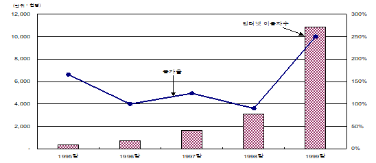 (1) 인터넷 저변 확대를 통한 기본 수요 환경 조성 : 우리나라는 1990년대 중반 이후 인터넷PC가 상업용으로 보급되기 시작하면서 인터넷 이용자가 급격하게 증가하여 1999년 말에는 1,000만명을 상회한바, 이로 인해 인터넷뱅킹 접근성을 보장받을 수 있는 사회적 인프라가 조성되었습니다.(표 1) 따라서 타행이 수행하는 정도의 인터넷뱅킹 전략을 추종해도 시장의 수요상 인터넷뱅킹의 이용량을 어느 정도 보장받을 것으로 판단했을 것입니다.
