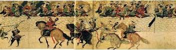 몽고습래회사(蒙古襲来絵詞, “몽골 침략에 대한 삽화 기록”)는 다케자키 스에나가(竹崎 季長, 1246–1314)가 몽골의 침공 동안 자신의 전투 행적과 용맹을 기록하기 위해 의뢰한 두루마리입니다. 이 두루마리는 두 개의 에마키(絵巻物, 그림 두루마리)로 구성되어 있으며, 각각 1274년의 분에이 전투와 1281년의 고안 전투를 다루고 있습니다. 이 삽화들은 가마쿠라 시대의 무사 사회와 전투 문화를 이해하는 데 중요한 사료입니다. 스에나가의 군사적 용맹을 강조하는 동시에 가마쿠라 정부로부터 전투의 공로를 인정받고자 했던 그의 정치적 노력도 보여줍니다.