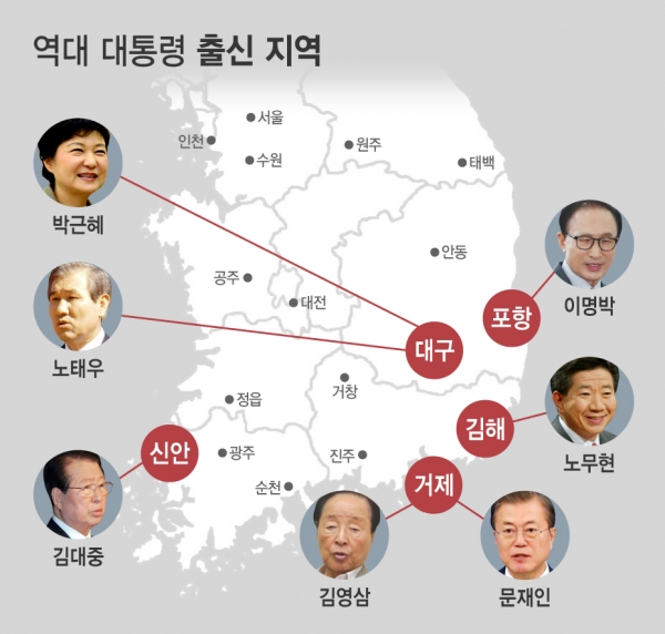 문민정부 수립한 1992년 이후, 대한민국 대통령 자리에 오른 인물은 김영삼·김대중·노무현·이명박·박근혜 전 대통령과 문재인 대통령 중 김대중 전 대통령을 제외하면, 다른 다섯 명의 대통령은 모두 영남 출신으로, 이는 심지어 민주당 계열의 인사가 대통령이 되어도 그 사람은 한명을 제외하면 모두 경상도 출신이란 뜻입니다(노무현, 문재인) 물론 이번 대통령 윤석열은 서울특별시 태생의 정치인이지만 그 역시 몸담던 정당의 정치적 기반은 영남이란 점을 고려할 때 우리나라에서 영남이 가지는 정치적 의미는 크다고 볼 수 있습니다. 다만, 이러한 현상은 대한민국 정치의 지역적 편향을 반영하는 것으로 볼 수 있습니다. 영남 지역은 전통적으로 보수 정당의 영향력이 강하고, 선거에서 높은 표 차를 보이는 지역입니다. 반면에 수도권이나 충청권은 진보 정당의 영향력이 강하고, 선거에서 경합이 치열한 지역입니다. 이런 지역적 특성은 대통령 선출에도 영향을 미치고 있습니다.